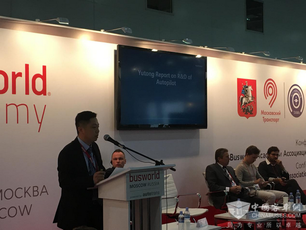 此外,在展会期间,俄罗斯客户经理曾哲还代表宇通在Busworld会议上发言,与行业专家一起分享了宇通在自动驾驶领域所取得的成就。曾哲介绍:“自动驾驶是一个未来不可逆的发展趋势,宇通在自动驾驶领域投入了大量的研发精力,也取得了一定的成绩。自主巡航、360度环视、自主避让、自动刹车、油门防错等功能,已经在宇通纯电动客车上得到了批量应用,可以降低80%-90%的人为事故。”
