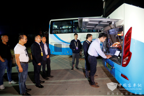 3天会议期间,金旅售后服务中心抽调十余名维修技术骨干人员,同配套企业组成二十余人服务团队,成立服务保障指挥部和五个服务保障组,至第一现场服务保障。指挥部通过监控平台实时查看所有参会车辆的位置、数据、报警信息等,对每台车辆运行状态了如指掌,及时协调派工。车辆保障采用“集中-分散-集中”服务模式,即早上出车时,服务人员集中晨检车辆,所有车辆顺利发班;运行过程中,各服务保障组全程跟车押运,确保车辆安全正常运行;晚上收班时再对车辆系统部件点检。