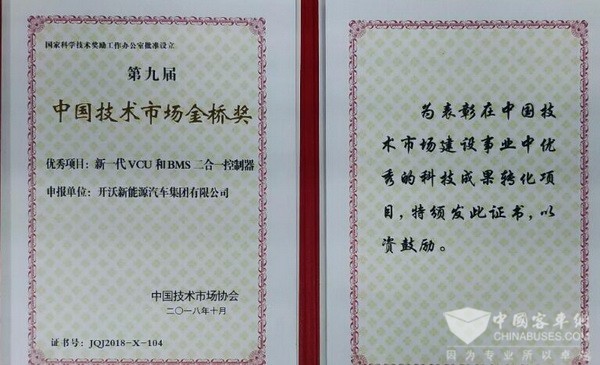2018年10月31日第九届中国技术市场金桥奖评审结果揭晓,开沃新能源汽车集团有限公司的“新一代VCU和BMS二合一控制器”荣获“优秀项目奖”,这也是开沃汽车首次获得国家级技术金桥奖。