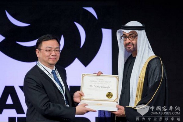 2014年,比亚迪公司董事长兼总裁王传福获得“扎耶德未来能源奖”个人终身成就奖领奖画面