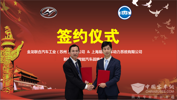 苏州金龙副总经理邱远红(左)和上海易巴总经理李付相(右)签署战略协议