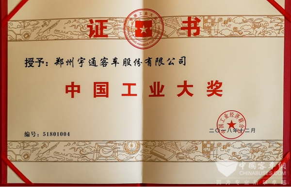 2018年12月9日,第五届中国工业大奖发布会在北京人民大会堂举行。中国工业大奖是经国务院批准设立的我国工业领域的最高奖项,每两年评选一次。本届评选,全国仅12家企业获此殊荣,宇通客车凭借在工业领域的出色表现和突出贡献成为大奖有史以来首批获此殊荣的汽车企业之一,并受到组委会称赞,成为新时代下“走出去”的典范。