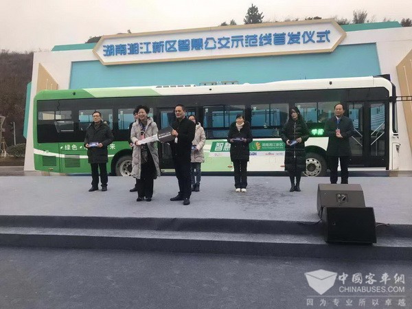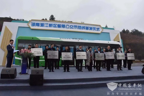 2018年12月28日,湖南湘江新区智慧公交示范线首发仪式在国家智能网联汽车(长沙)测试区举行。标志着长沙智能网联汽车从封闭园区测试到开放道路示范应用迈出了坚实一步,这也是国内首条开放道路智能驾驶公交示范线。首发仪式上,还举行了湖南湘江人工智能学院授牌仪式。