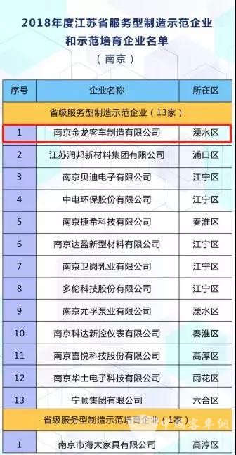 近日,江苏省工信厅公布了2018年度江苏省服务型制造示范企业和示范培育企业名单。其中,南京有14家单位入选,南京金龙榜上有名!