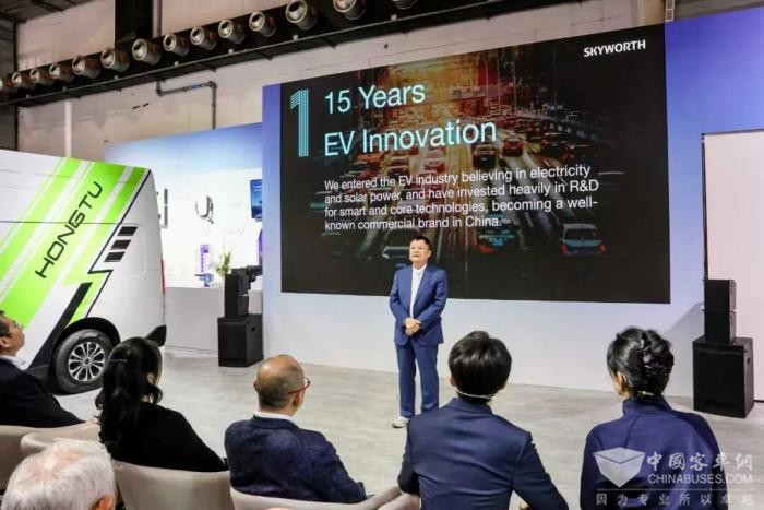 开沃集团、创维汽车创始人黄宏生先生于发布会现场致辞并表示:“欧洲市场是创维汽车全球化战略的重要组成部分,此次在世界客车博览会上的首秀,创维汽车不仅展示了其在新能源商用车领域的技术实力与产品布局,也传递出与全球伙伴携手推进绿色、智能、安全出行的坚定承诺。”