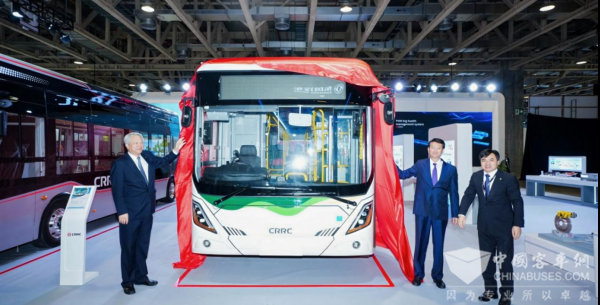 国务院国资委党委委员肖宗辉、南光集团董事长傅建国带领参展嘉宾到中国中车展台参观交流,在现场与中国中车总经济师谭沐共同为中车新款12米低地板电动巴士揭幕。