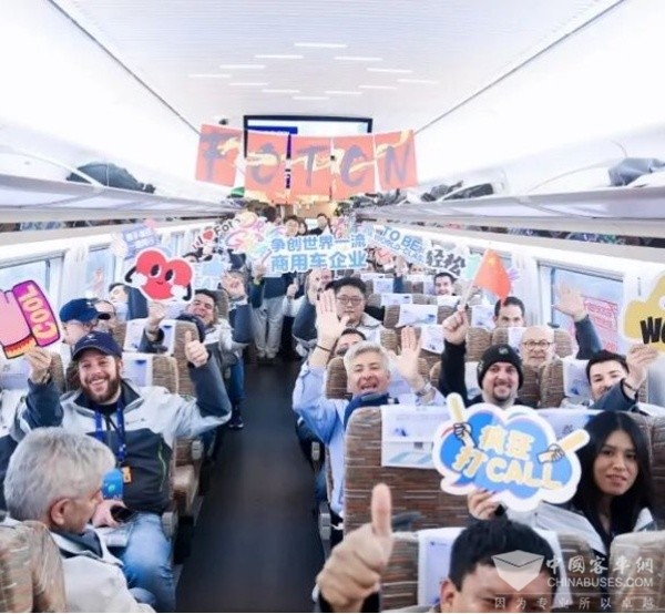 车厢内,浓厚的盛会氛围扑面而来。"FOTON"标识与中国传统纹样相映成趣,车窗上"FOTON"创意贴画与"中国速度"的主题标语相得益彰,打造出一个移动的品牌展厅。工作人员手持大会标语,热情引导交流,在疾驰的列车中向嘉宾讲述福田汽车的全球化故事。