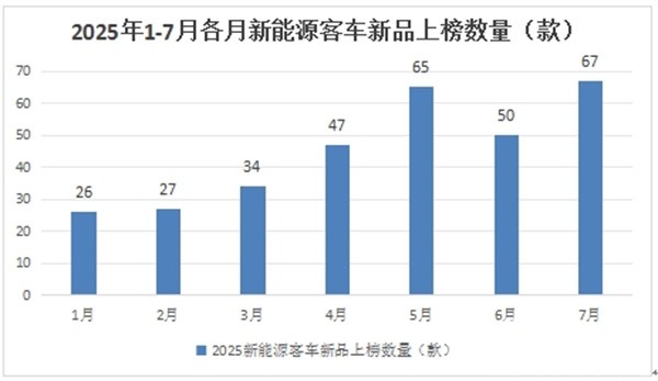 上图表显示,2025年7月工信部发布的第397批公告中,上榜新能源客车新品67款,创下今年以来各月新高。因此成为第397批新能源客车公告的一个特点。这意或许意味着今年下半年我国新能源客车可能将迎来新的一轮增长。据分析主要得益于2025老旧新能源公交车淘汰更新补贴政策的全面落实和进一步落地执行。