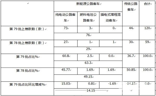 表1,第79批交通部达标车型公告上榜的各动力车型数量、占比与上一批环比(数据来源:交通部)