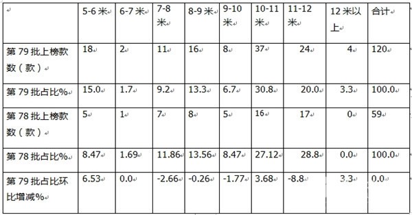 表2,根据交通部数据,第79批客车达标车型公告中上榜的各长度段车型数量、占比比及环比增减统计: