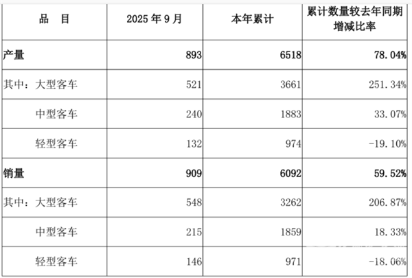 2025年10月10日,安凯客车(000868)发布公告,2025年9月份产销数据快报显示,在销售方面,2025年9月份的销售量为909辆,同比(去年同期销量292辆)增长2.11倍(211.3%); 2025年前9月累计销量6092辆,累计同比增长近6成(59.52%)。