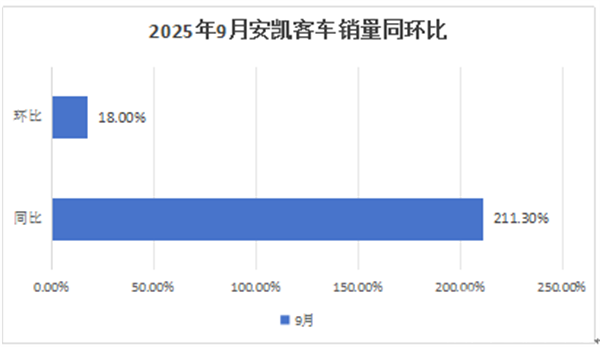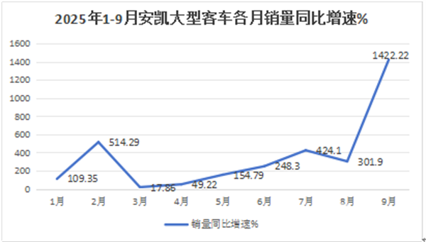 上图表可见,2025年9月安凯客车销量909辆,销量居2025年1-9月第二(第一是6月的964辆);同比增长211.3%,增速创下2025年1-9月各月同比增速最高!