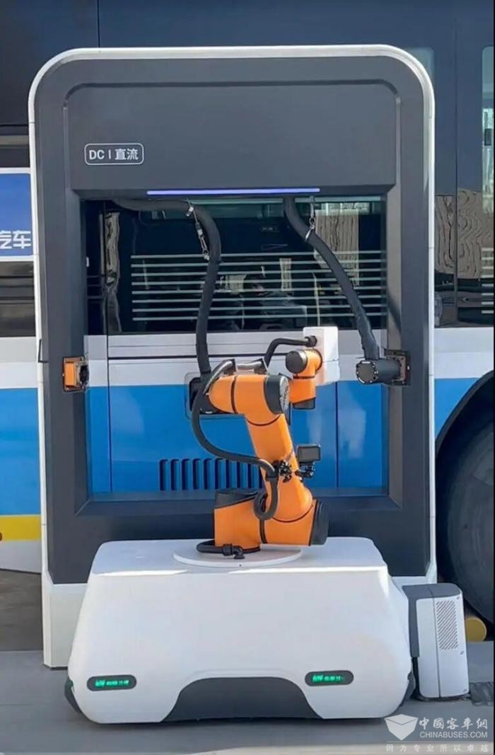 这个充电站还首次试点安装了自动充电机器人,主要为无人驾驶车辆充电做技术储备。隆瑞三优新能源汽车科技有限公司技术管理部负责人安振佳介绍,未来计划在更多充电站内推广。这个自动充电机器人综合了自动化和智能化技术,主要包含六轴协作机械臂、视觉定位系统、调度云平台和5G通信模块等自动化系统。充电时可以智能感知车辆停靠位置,实现远距离准确识别充电口,利用机械臂给车辆插拔枪完成自动充电,真正实现充电自动一体化,提高了充电效率、增强了充电安全。