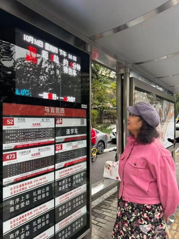下午2点左右,在马官营西公交站台上,70岁的乘客张女士正在查看电子站牌,上面显示她要乘坐的52路公交车距此还有2站,将在3分钟后到达。出门几乎都坐公交的她说:“这挺方便的,能够掌握时间,心里有数到时候,几站,来了以后就不着急,要不然的话不知道等多长时间,因为我们岁数大了以后眼睛也花,应用起手机上的东西就稍微复杂一点,心明眼亮的这个。”