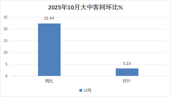 根据中国客车统计信息网数据,2025年10月,其重点关注的27家客车企业6米以上客车销量13326辆(本文以下大中型客车销量均指6米以上客车),环比上月的12909辆增长3.23%,同比增长22.43%,可见今年10月我国大中型客车市场呈现了同环比“双增”的发展态势,坐实“银十”、且胜过“金九”!