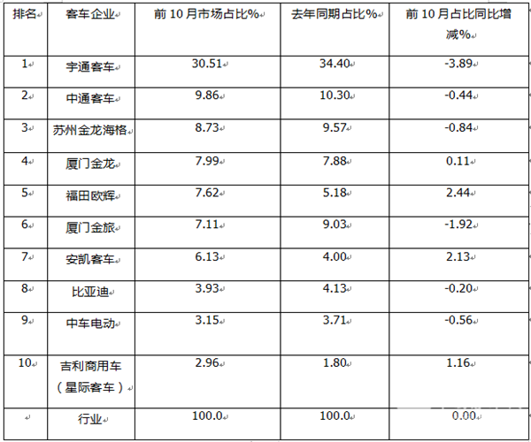 表,根据中国客车统计信息网数据,2025年前10月6米以上客车top10市场占比及占比同比增减: