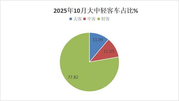 从占比看,大、中、轻客车占据2025年10月客车总销量的比例分别为11.09%、11.09%和77.82%;