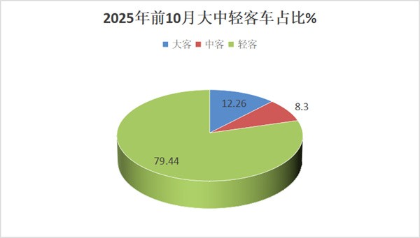 从市场占比看,今年前10月大中轻客车销量占比分别为12.26%、8.3%和79.44%