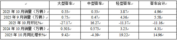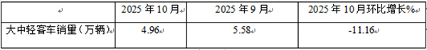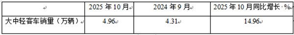 表1、2025年10月大中轻客车同比增长14.96%(数据来源:商用车专业委员会提供的批发信息):