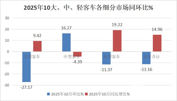 1、2025年10月大中轻客车同比增、环比降: