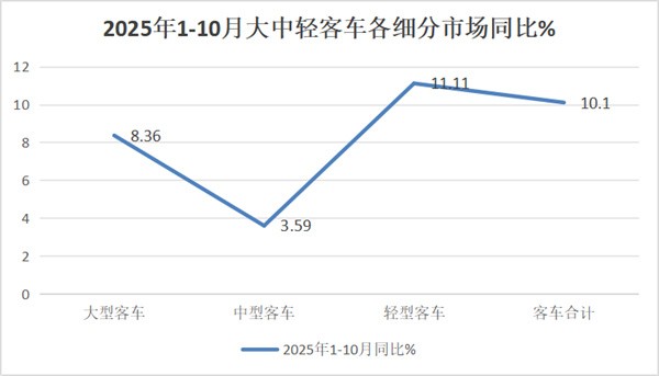 2025年1-10月大中轻客车增速均不高,说明2025年1-10月我国大中轻客车各细分市场,主要是当前经济大环境不是太“给力”,各行业对大中轻客车的需求动力仍然显得不是很强劲。