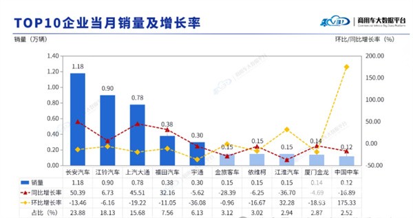 ---重庆长安、江铃汽车、上汽大通排行前三;销量均在0.75万辆以上;其销量分别为1.18万辆、0.90万辆和0.78万辆;其中长安汽车夺冠;其余车企销量均在0.4万辆以下;