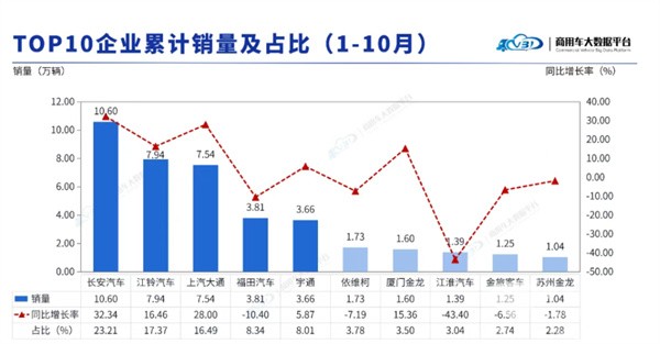 特点六、前10月累计:长安、江铃、大通居前三,长安领涨