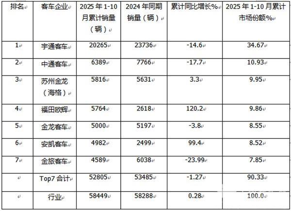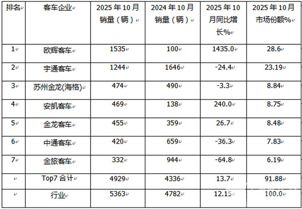 表1,根据中国客车统计信息网数据,2025年10月6米以上传统动力客车销量top7排行(只统计销量在300辆以上主流车企)