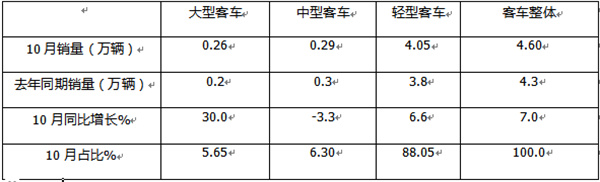 ---大型客车销售0.26万辆,同比增长30%,跑赢并领涨国内客车大盘(7%);市场占比5.65%。据分析主要是10月正值国庆和中秋“双节”来临的前期,旅游市场旺盛,市场对大型公路客车需求增多所致。