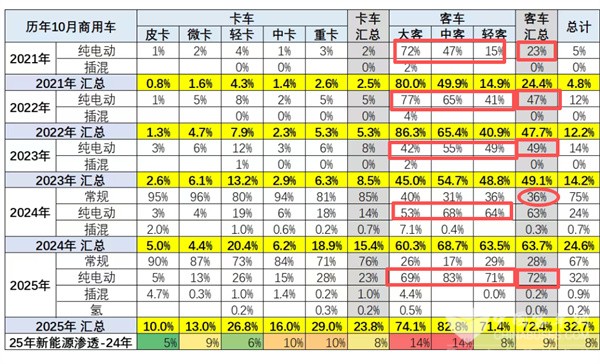 1、10月国内客车新能源渗透率同环比“双提升”