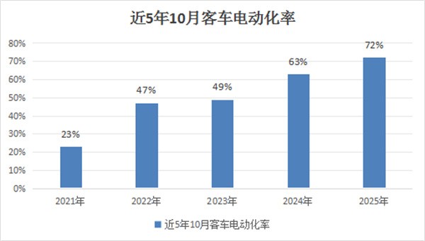 上图显示,2025年10月国内客车电动化率超7成(72%),创近5年同期最高。换言之,2025年10月我国客车电动化率创下近年同期新高。由于在2021年之前的任何年份的10月份,国内客车电动化均没有超过30%,因此完全可以断定,2025年10月我国客车新能源化率创下史上同期最高,因此成为2025年10月国内客车市场的一个突出特点。据分析主要得益于: