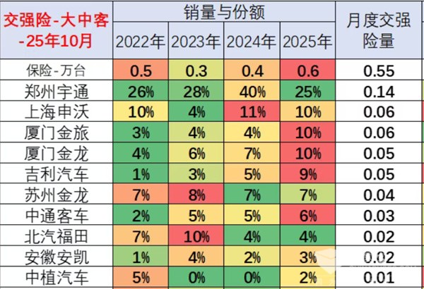 上图可见,2025年10月国内大中客市场竞争格局前10车企中,宇通\申沃\厦门金旅居前三,其中宇通销量0.14万辆、市场占比25.5%居于绝对的霸主地位。