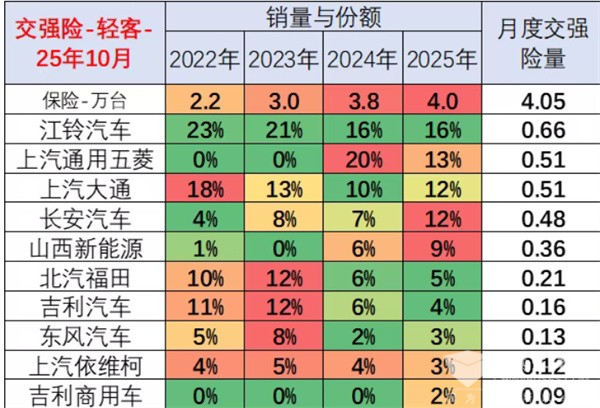 上图可见,在2025年10月国内轻型客车市场竞争格局前10车企中,江铃\上汽通用五菱\上汽大通居前三,其中江铃汽车销量0.66万辆、市场占比16.3%居榜首。