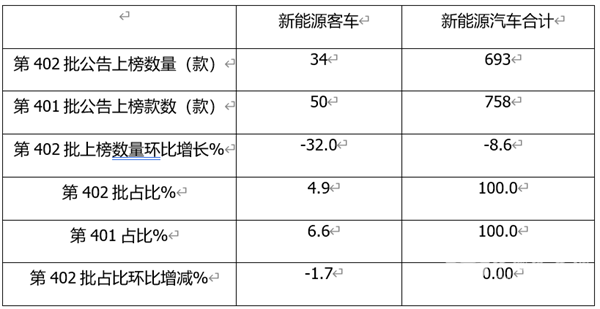 表3,根据工信部第402批公告统计数据,按技术路线划分,各车型上榜数量占比及占比环比增减: