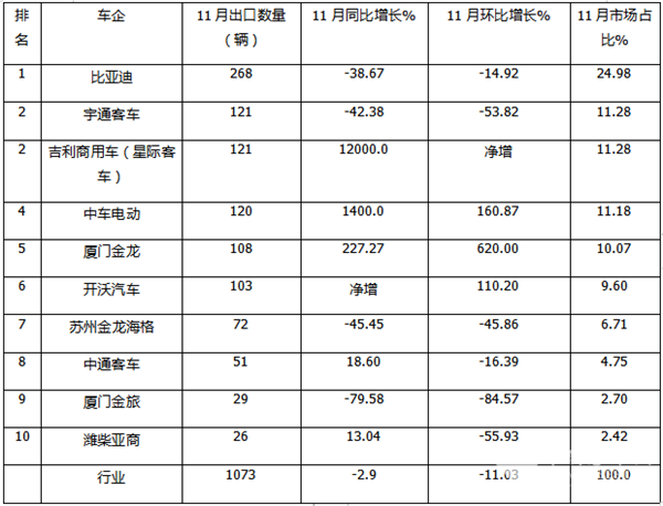 11月新能源客车出口:同环比双降再遇冷 比亚迪夺冠 金龙环比大涨