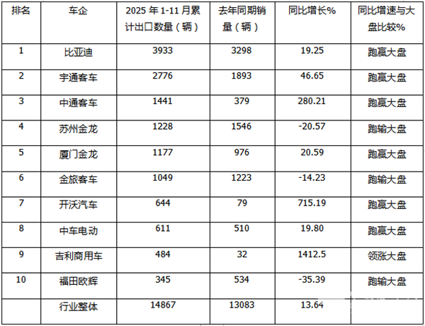 上表显示,在2025年1-11月我国新能源客车累计出口前10车企中: