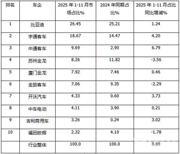 表4,根据中国客车统计信息网数据,2025年1-11月前10车企累计出口占比及占比同比增减: