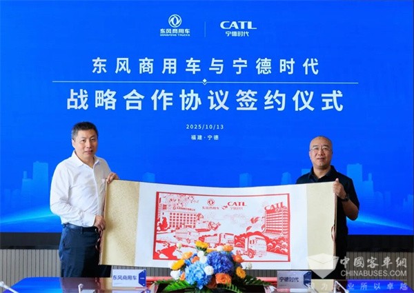 2025年10月13日,东风商用车与宁德时代在福建宁德举行战略合作签约仪式,基于过往成功的合作经验及未来愿景,双方正式确立新一轮五年长期战略合作,将在商用车电动化领域围绕前沿技术开发和应用、海外市场拓展、后市场发展以及行业生态共建等方面强强联合,互利共赢。