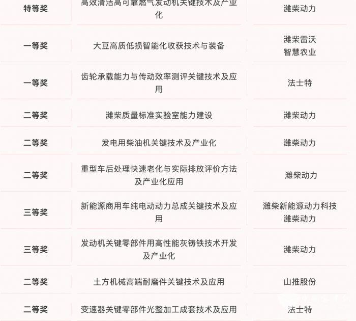 乐竞官方网站2025年10月28日获悉,中国机械工业联合会、中国机械工程学会发布《关于表彰“2025年度机械工业科学技术奖”奖励项目的通报》,揭晓2025年度“机械工业科学技术奖”获奖名单。山东重工权属企业荣获10项科技进步奖,其中潍柴荣获特等奖1项,二等奖3项,三等奖2项;潍柴雷沃智慧农业、法士特分别荣获一等奖1项;山推股份、法士特分别荣获二等奖1项。