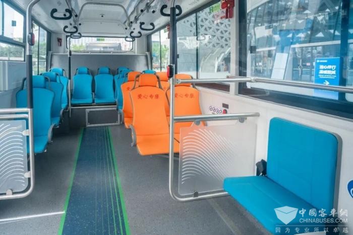 6.5米“地铁巴士”对比市场同级产品,车内空间加长约30-40cm,可通过优化内部空间布局,增设一排座椅,进一步满足“平时出门有座位,高峰出行多拉人”的公交运营需求;同时,取消了最后一排座椅下方的台阶,实现车内全平地板结构;全车搭配感应防夹车门,老人、小孩上下车更安心,配备通透大窗户与无落地扶手,婴儿车、大件李畅行无阻;皮质座椅、USB充电口等舒适配置,为市民的短途通勤与“续电”需求提供更加全面的保障。