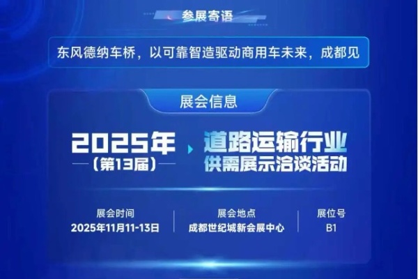 2025年11月11日-13日 四川成都 2025道路运输行业供需展示洽谈活动,开幕倒计时1天! 东风德纳电驱桥以可靠智造驱动商用车未来 成都世纪城新会展中心B1展台 邀您共赴商用车电动化转型未来之约