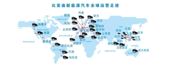 在海外,比亚迪纯电动大巴已然成为了“中国制造”的代名词。早在2011年10月,比亚迪在美国加州洛杉矶建成北美总部。2013年5月,比亚迪在美国加州兰开斯特建设电动大巴和电池工厂,并于2014年4月迎来首台纯电动大巴下线。2015年2月,K9纯电动公交车漂洋过海,成功登陆日本东京,成为首个成功进入日本市场的中国汽车品牌。2015年6月,在马来西亚总理纳吉布的见证下,由比亚迪15辆纯电动大巴组成的全球最大电动BRT公交系统正式投入马来西亚。2015年11月,35辆纯电动机场摆渡大巴在荷兰机场投放运营,成为欧洲最大的一支纯电动大巴车队。